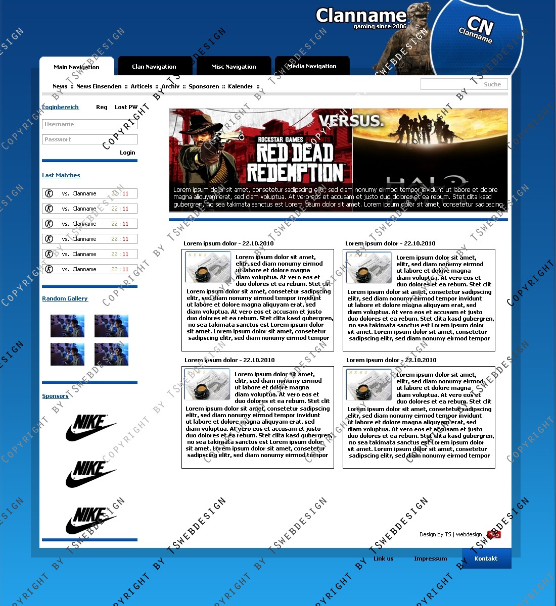 Ein super Design für ein Clan. Die Farben sind  Blau-Weiß , auch änderbar als Zusatzmodul. Oben eine Figur von Mordern Warfare 2, dort können natürlich auch andere Darsteller hin designed werden, dass ist Ihnen überlassen. Das Logo habe ich passend zur page gemacht wo man nur noch den Clanname etc. richtig umbennen muss.