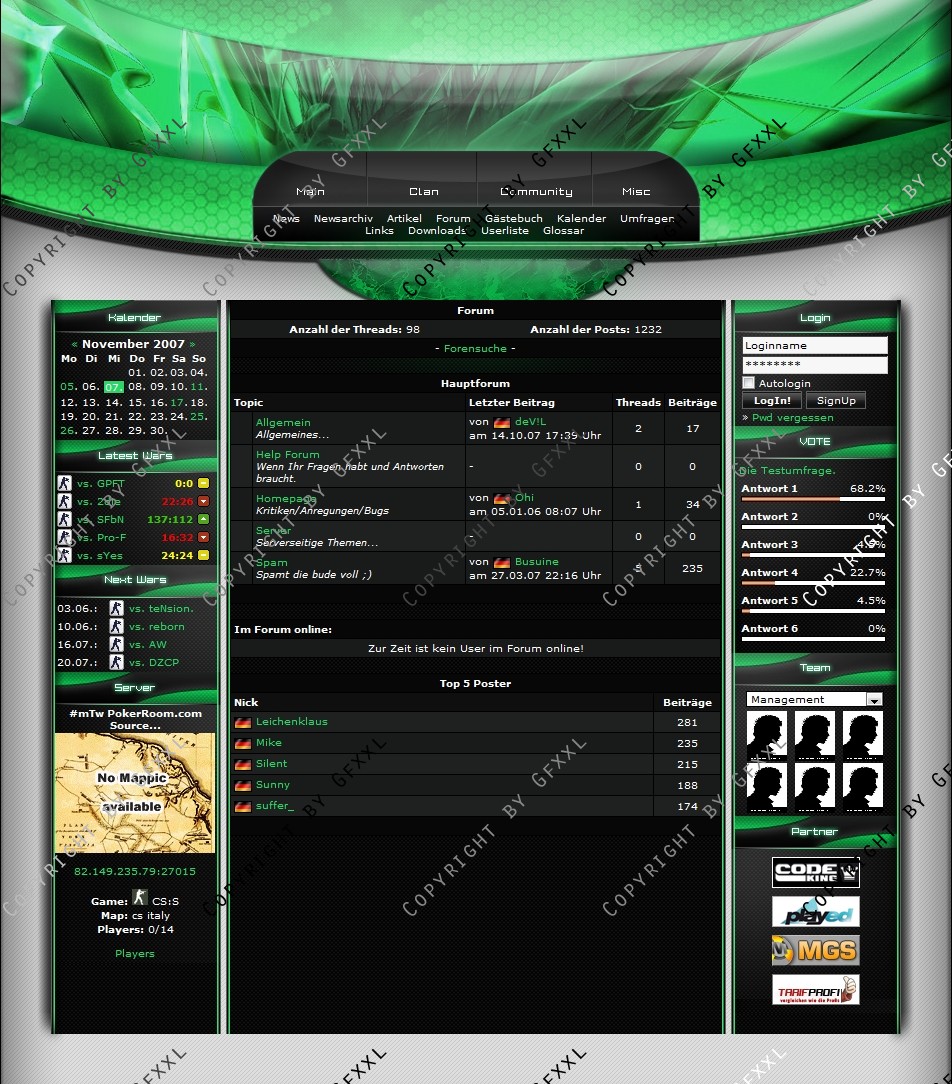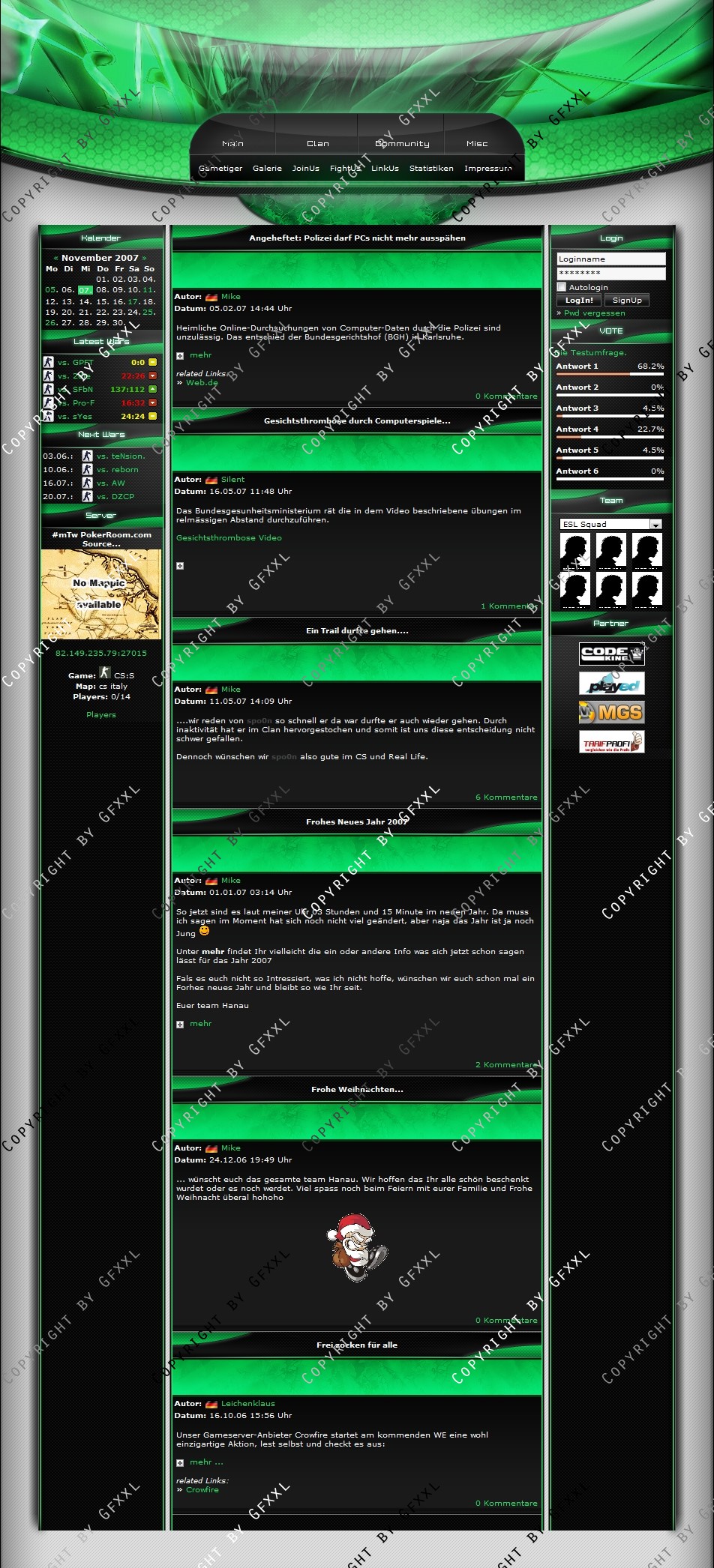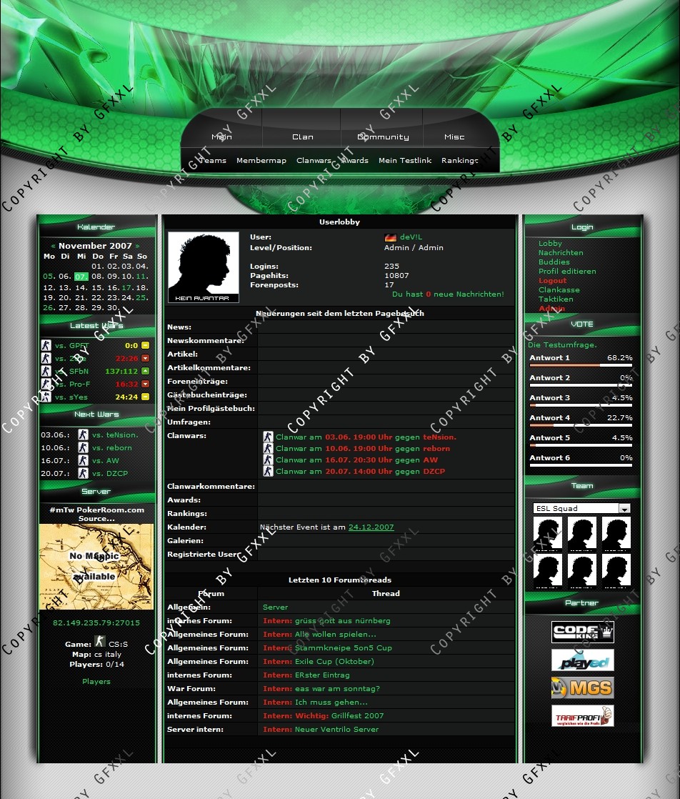 Wir sind mit unserem Templete von ClanDesigns.org und CodeKing.eu voll und ganz zufrieden. Alle unsere Änderungswünsche sind sehr gut gelungen und die Installation war ein Kinderspiel. Der Support ist genial schnell, freundlich und echt nicht aus der Ruhe zu bringen :-) Super schnelle und gute Lösung für jeden Clan der sich von der Masse abheben will.