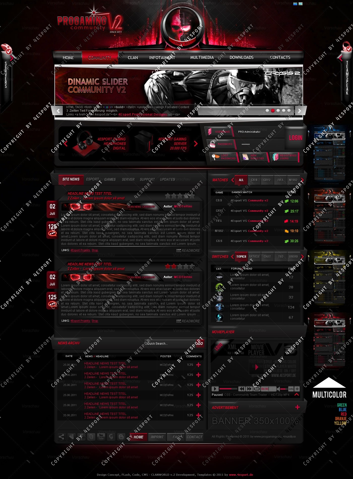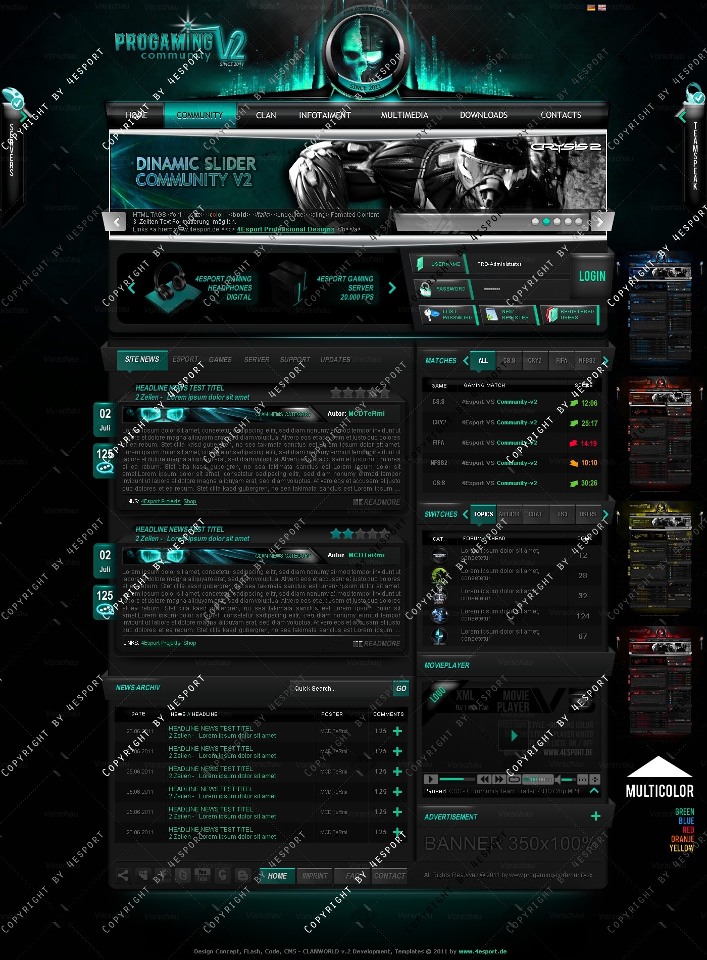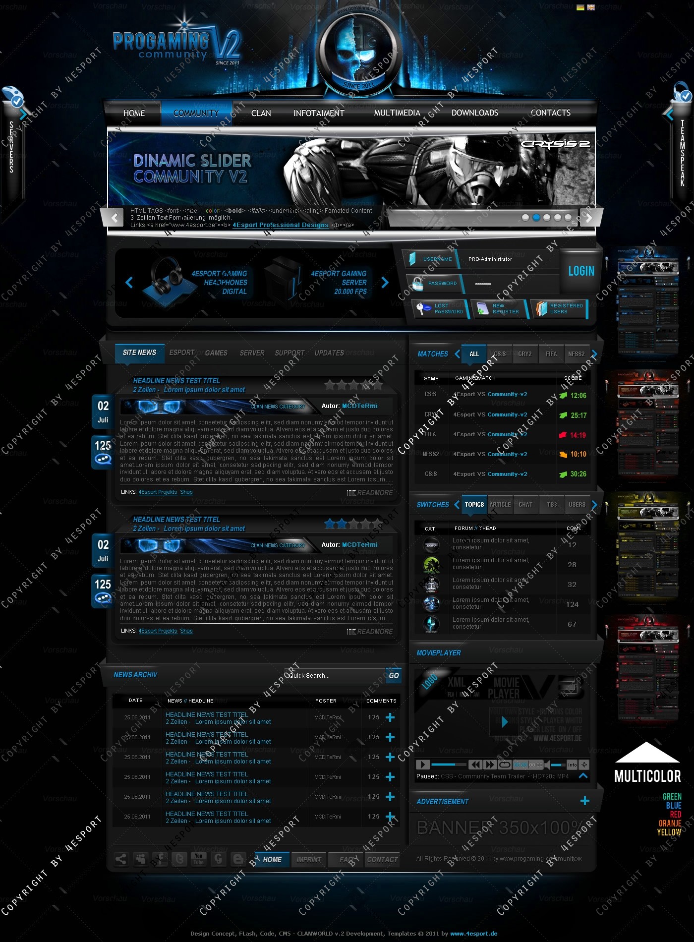 PROGaming Community V2 - Templates Premium Edition mit Flash Player 1 V3 Custom Edition und Featured System, CMS Erweiterung Webspell 4.2.2a, wird auf wünsch auf ClanWORLD v1.1 auch gecodet.